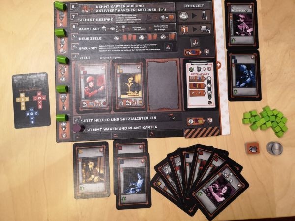 Die Aufgaben für die Spieler sind vielfältig. Man muss jede Runde auf zufällig ermittelte Ressourcen planen, seine Kartenhand, die Ablageflächen sowie das Krankenhaus organisieren, die Finanzen im Blick behalten, die Bezirke von Hong Kong sichern und potenzielle Mitarbeiter anwerben und ausstatten. Insbesondere dem Einsatz und Anwerben von Mitarbeitern muss eine Menge Aufmerksamkeit gewidmet werden, damit man seine Maschine ans Laufen bringt, aber hier beginnt das Dilemma. Für die richtigen Arbeitskräfte benötigt man Geld, für Geld muss man die richtigen Ressourcen haben und Ziele erfüllen. Für diese benötigt man wiederum die richtigen Mitarbeiter. Hinzu kommt, dass man einige Ziele nicht einfach auf die nächste Runde verschieben kann. Organisiert man seine Ablage nicht richtig, können wichtige Ziele erst diverse Runden später erfüllt werden und dies bedeutet zumeist, keine Chance mehr auf den Sieg zu haben.