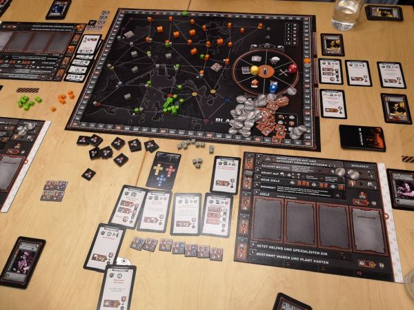 Zunächst fällt dem Betrachter die Gestaltung ins Auge. Natürlich sind schwarz und wenig kontrastreiche Farben vorherrschend im Design. Es gibt einen Spielplan, der an eine dunkle Version von „Pandemie“ erinnert und Personenkarten mit Porträts darauf, die eine eher gedrückte Stimmung verbreiten. Das mag manche Spieler in Summe zwar stören und wird vor allem nicht von jedem hübsch gefunden werden, aber thematisch wurden keine Kompromisse eingegangen und der permanente Stromausfall wird hier wirklich sehr gut herübergebracht. Des Weiteren gibt es die üblichen Pappmarker, Holzwürfelchen, Karten, den Startspielermarker und drei Ressourcenwürfel in verschiedenen (diesmal leuchtenden) Farben.