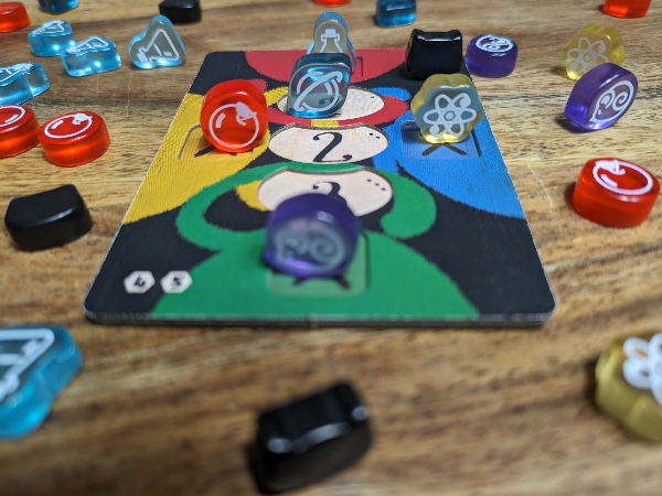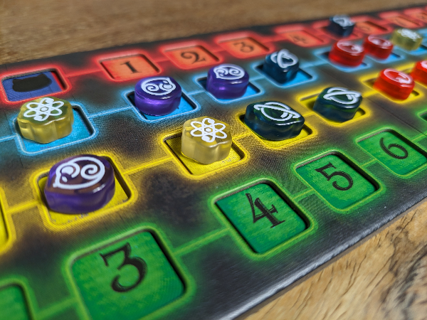 An der Box und dem Inhalt kann es schon mal nicht liegen, dass das Spiel nicht zündet. Die Pappauslagen auf dem Tisch sind aus mehreren Schichten und in das zentrale Board können sogar Karten hineingeschoben werden, um eine gewisse Varianz zu ermöglichen. Blickfänger sind natürlich die durchsichtig-farbigen Acrylspielsteine, mit denen die gespielten Karten markiert werden. Zwar ist die Box hier eindeutig zu fummelig, aber liegen die Steine erst einmal auf dem Tisch, schlägt das Herz jedes Brettspielfans mit Vorliebe für Deluxe-Komponenten ein Stück höher. Tatsächlich nervt es mich aber sehr, dass die Steine beim Einräumen in kleine Reihenformationen gesteckt werden müssen. Eine Vertiefung für alle wäre mir deutlich lieber gewesen.