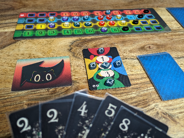 So seltsam das für ein Stichspiel auch ist, die Karten haben keine Farbe. Irgendwie stimmt das aber auch nicht. Die Karten haben eine Farbe, aber eben nicht, solange sie noch nicht ausgespielt wurden. Das ist natürlich eine Anspielung auf die berühmte Katze in einer Schachtel aus Schrödingers Gedankenexperiment, die so lange gleichzeitig tot und lebendig ist, bis man die Schachtel öffnet, um nachzusehen. Zu Beginn jeder Runde haben also alle einige farblose Karten mit Werten von 1 bis maximal 9 auf der Hand.