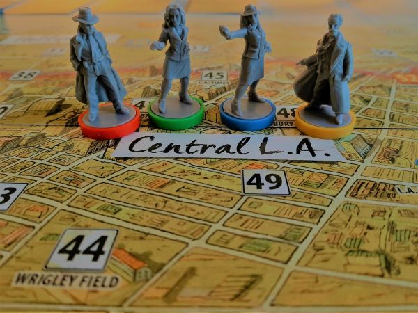 Und schon ist man mittendrin bei „City of Angels“, und wird mit neun Kriminalfällen des LAPD der 1940er Jahre konfrontiert. Nachdem man sich für einen „Detective“ (zwei weibliche und zwei männliche Charaktere stehen zur Auswahl) entschieden, die entsprechende Figur ausgewählt, die Ermittlungsakte erhalten und sein Tableau mit entsprechenden Markern und Plättchen vor sich ausgebreitet hat, lautet die spannende Frage: Und wie spielt man jetzt den eigenen „Detective“ in L.A., um die Fälle erfolgreich zu lösen?