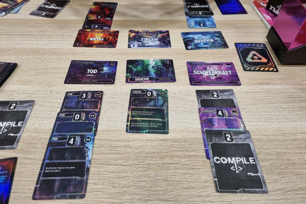 „Compile“ ist ein Kartenspiel für zwei Spieler, die in die Rolle zweier in Konkurrenz stehender künstlicher Intelligenzen schlüpfen. Die KI, die als erstes zwei Protokolle kompiliert, gewinnt das Spiel. Das Spannende an „Compile“ ist, dass durch den anfänglichen Draft der Protokolle jedes Spiel andere Anforderungen und Taktiken an den Spieler mit sich bringt.
