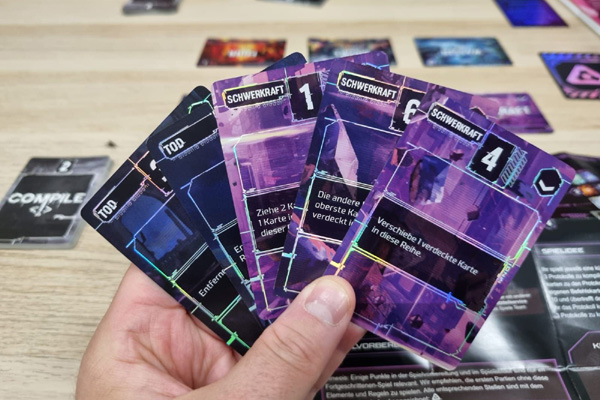 Fazit: „Compile“ ist ein sehr schnelles und taktisches Spiel. Es ist sehr spannend, wie aus einer Handvoll Regeln so viel taktische Tiefe rausgeholt wurde. Das Tauziehen um die Protokolle ist dramatisch und fast greifbar. Die sehr hochwertig gestalteten Karten liegen gut in der Hand und runden das Spiel super ab. Ich freue mich schon darauf, die Möglichkeiten durch die Mini-Erweiterung und „Compile 2“ zu erweitern und zu erleben, was noch alles machbar ist.