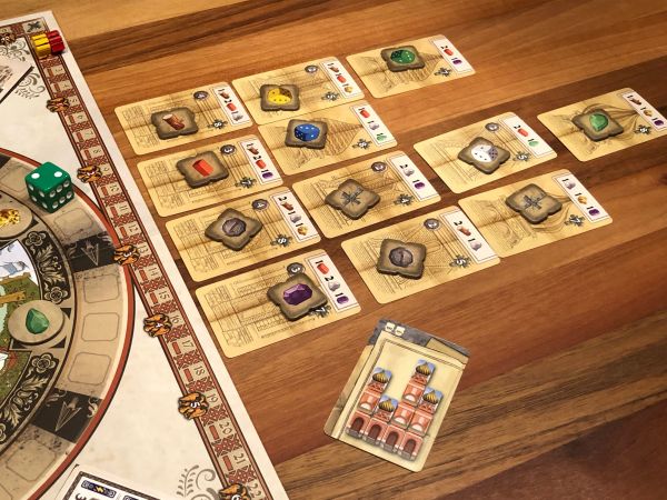 Die Basisaktion Bauabschnitt beanspruchen: Um an der Kathedrale bauen zu dürfen, müsst ihr zuerst den gewünschten Bauabschnitt für euch beanspruchen. Auf den einzelnen Bauabschnitten werden zu Beginn des Spiels sogenannte Werkstattplättchen platziert. Beansprucht Ihr einen Abschnitt mit einem eurer Banner, erhaltet ihr das jeweilige Plättchen. Entweder legt ihr dieses verdeckt auf ein beliebiges freies Werkstattfeld eures Werkstatt-Tableaus (nicht nutzbar), oder ihr bezahlt die angegebene Anzahl an Rubel und könnt den Vorteil des Plättchens immer nutzen, wenn ihr den entsprechend farbigen Würfel bewegt habt.