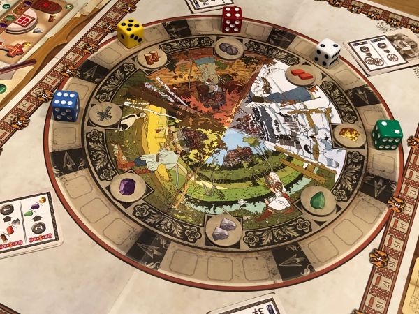 Zentrum des Geschehens ist der Spielplan mit dem kreisförmigen Markt. Dieser besteht aus 8 Bereichen mit je 3 Würfelfeldern. Jeweils 2 Bereiche bilden ein Viertel, das durch Einflusskarten Zusatzaktionen ermöglicht. Am Markt bekommt ihr durch das Einsetzen von Würfeln Ressourcen, die ihr für den Bau der Kathedrale benötigt. Außen herum befinden sich die Punkteleisten für Baupunkte und Ruhmespunkte, die ihr während des Spiels erhaltet.