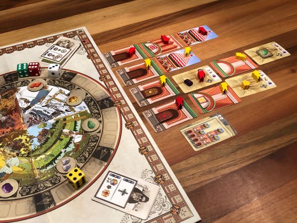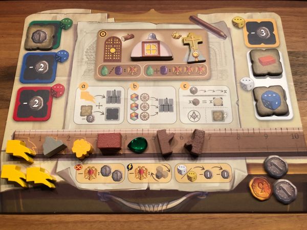 Auf den eigenen Spielertableaus verwaltet ihr eure Ressourcen (Baumaterial), eure verfügbaren Verzierungen und erworbene Sonderaktionen. Die Sonderaktionen stehen im Zusammenhang mit der Farbe eines Würfels. Wird dieser auf dem Markt bewegt, wird die Sonderaktion ausgelöst. Gegebenenfalls kommen noch weitere Effekte dazu.