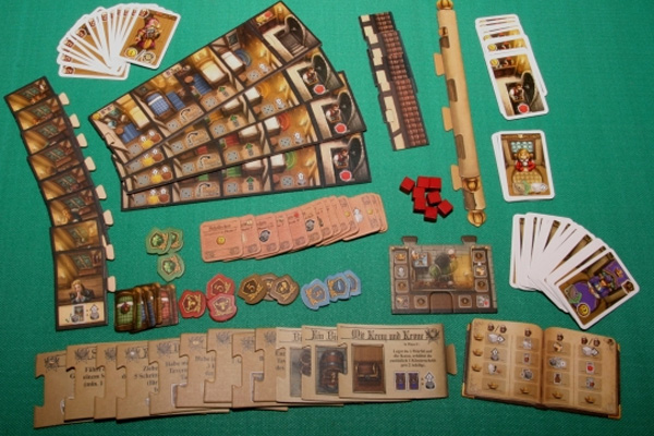 In der Schachtel findet sich jede Menge Material. Das reicht von Holzwürfeln über die Karten für den Deckbau bis hin zu diversen Pappteilen. Die Gestaltung ist wie auch im Grundspiel sehr stimmungsvoll von Dennis Lohausen umgesetzt. Das Flair einer Kneipe in einem mittelalterlichen Dorf kommt super rüber und wirkt wie aus einem Guss.