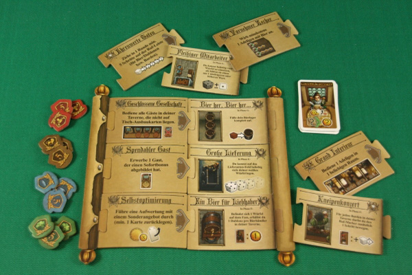 Um keine Missverständnisse aufkommen zu lassen: Ist das Spiel erstmal aufgebaut, dann haben alle eine wunderbare Taverne vor sich liegen. Man hört förmlich das typische Plätschern, wenn Bier in einen Humpen gegossen wird, und die Musik der Gaukler. Man will sofort loslegen und die ersten Gäste an den Tischen platzieren. Wäre der Start doch nur nicht so kompliziert.