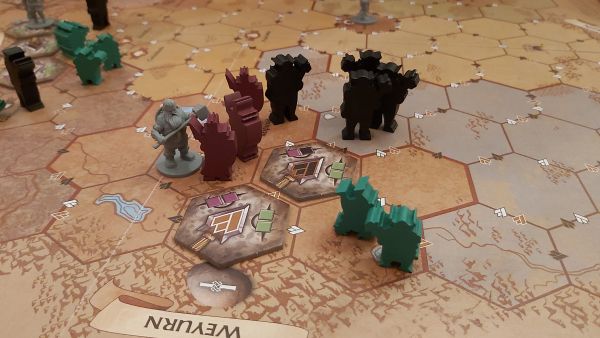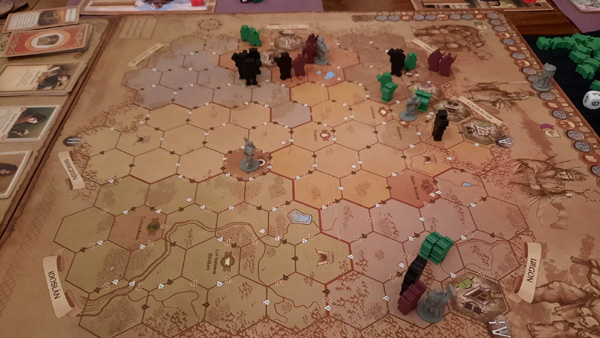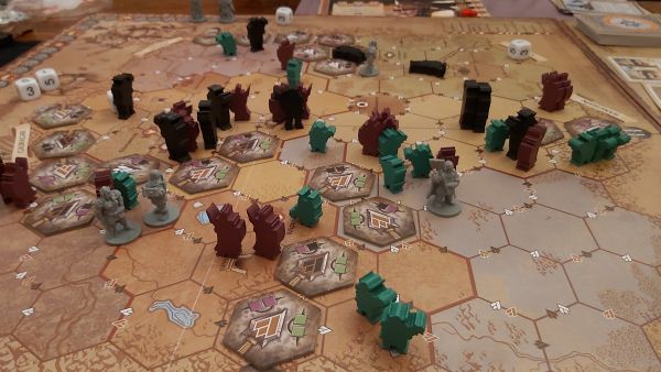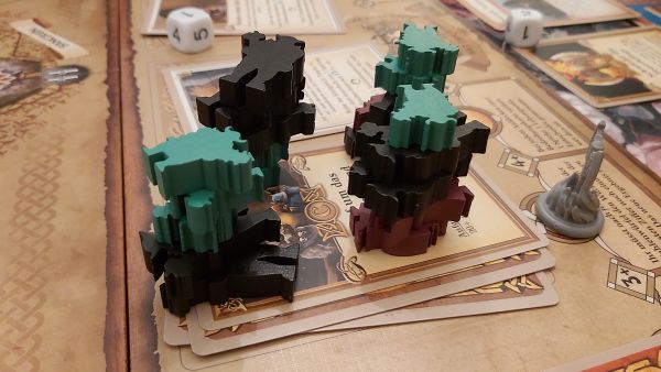 Nun noch ein paar Worte zum Spielmaterial und den Regeln. In der „Big Box“ haben sich, im Gegensatz zur alten Grundbox, ein paar Sachen geändert, die, wie ich finde, nicht alle positiv sind. Die Meeples der feindlichen Armeen haben mir als farbige Würfel besser gefallen. Nicht nur, dass die Meeples für meinen Geschmack viel zu groß für die „kleinen“ Felder der Landkarte sind, darüber hinaus sind einige Meeples unsauber geschnitten oder sogar verschnitten. Bei einem fehlte ein Bein und bei ein paar anderen waren falsch gesetzte Schnitte im Holz. Bei einem Meeple führte es dazu, dass man beim Betrachten der Figur den Kopf in der Hand hatte. Hier wären mir die Holzwürfel oder kleine Figuren aus PVC (analog zu den Spielerfiguren) lieber gewesen.