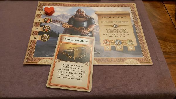 Je nachdem wo sich die Axt auf der Leiste „Rat der Zwerge“ befindet, tritt ein positiver oder negativer Effekt auf. Zum Beispiel „Würfel den höchsten Würfel bei einem Wurf der Zahlenwürfel erneut“ oder „Immer, wenn eine Bedrohungskarte aufgedeckt wird, bekommt ein Zwerg einen Lebenspunkt zurück“. Über die Aktion „Dem Rat der Zwerge eine Nachricht schicken“ (ein Wurf auf die Handwerkskunst) kann der Marker in die positive Richtung verschoben werden.