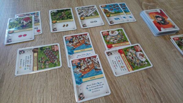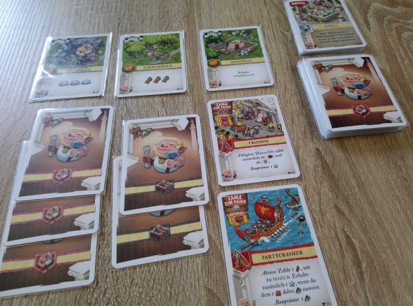 Richtig eingesetzt haben die Trajana zudem auch die bislang spielstärksten Karten. „Minervas Segen“ und „Amors Segen“ sorgen frühzeitig für extrem viele Ressourcen, „Erweiterter Streitwagen“ wandelt ein Holz in 3 Siegpunkte um und später werden auch noch mit dem „Trebuchet“ mindestens 6 Siegpunkte pro Runde auf die Siegpunkteleiste katapultiert. Es ist dann fast schon ein Wunder, wenn man nicht spätestens mit der 3. Runde das Spiel beenden kann. Hinten raus lohnen sich bei zu vielen ausgespielten Karten auch oftmals die Aktionen nicht mehr so stark wie am Anfang, sodass es nur bei längeren Spielen mit diesem Clan eng wird, nicht ganz oben auf dem Podest zu stehen. Es beschleicht einen das Gefühl, dass man mit diesem Clan so gut wie immer gewinnen kann, wobei nicht nur der Schwierigkeitsgrad etwas zu hoch angegeben ist, sondern auch die Karten in ihrer Gesamtheit diesen Clan gegenüber den anderen bevorteilen. Er macht zweifelsohne Spaß, wirkt jedoch nicht ganz so ausgewogen im Vergleich zu den anderen.