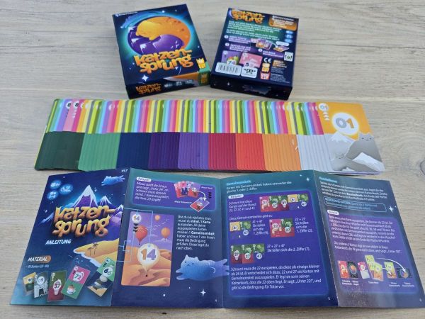 „Katzensprung“ ist ein leichtes Katzenabwurf- respektive Kartenabwurfspiel für nebenher. Es will nicht anstrengend sein. Während des Spiels gehen dem verkopften Spieler folgende Fragen durch den Kopf: Welche Bedingung wird mein Mitspieler wahrscheinlich nicht erfüllen können? Wie kriege ich die meisten Karten ausgespielt? Lohnt es sich, auf die vierte Karte zu warten, wenn man doch schon drei Karten mit Gemeinsamkeit auf der Hand hat? Wie stelle ich sicher, wahrscheinlich bedienen zu können? Welche Kompromisse gehe ich dafür ein? Und wo finde ich auf der Karte die Katzendarstellung? Am Ende hängt aber doch viel vom Nachziehglück ab.