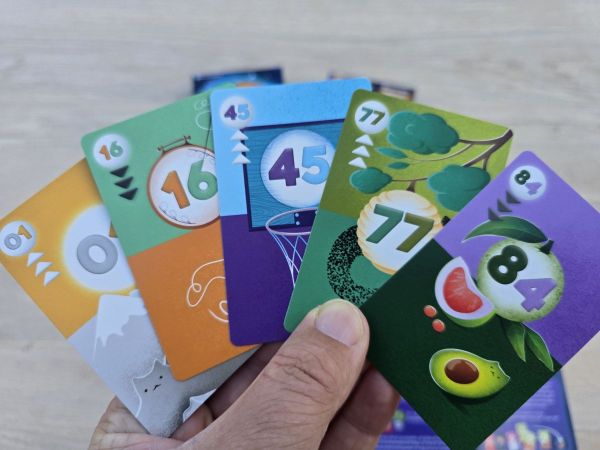 In der kleinen Schachtel im bekannten Kartenspielformat findet man neben der Anleitung 90 Karten einfacher Qualität. Auf jeder Karte sind Katzen illustriert – manchmal als Blätter an einem Zweig in einer Vase, manchmal als aufgeschlagene Kokosnuss mit Cocktail im Hintergrund und manchmal als Eistopping. 90 Karten – 90 verschiedene Illustrationen. Nicht nur Katzenliebhaber werden beim Anblick der fantasievollen Zeichnungen ins Schnurren geraten. Jede Karte ziert außerdem eine einzigartige zweistellige Zahl mit passender Farbkodierung, die sich auch im Kartenhintergrund in der oberen und der unteren Hälfte wiederfindet. Benachbarte Ziffern (so wie die „2“ und die „3“) sind im Farbton manchmal arg nah beisammen, was die Unterscheidung „auf einen Blick“ erschwert. Leider haben die Karten nur oben links ihren Zahlenwert aufgedruckt. Damit ist die „Fächerrichtung“ streng vorgegeben.