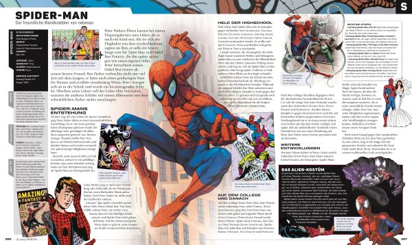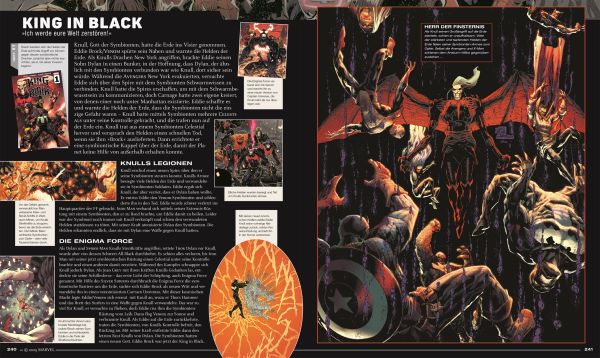 Eingestreut in diese Figurenporträts sind immer wieder Großereignisse der Historie des Marvel-Universums. So erfährt man auf jeweils zwei bis vier Seiten beispielsweise etwas über das Age of Ultron, die zwei Civil Wars, das Empyre oder das Spider-Verse. Auch Superhelden-Teams werden vorgestellt, allen voran natürlich die Avengers auf gleich acht Seiten. Aber auch der kanadischen Truppe Alpha Flight, dem jugendlichen Power Pack, Magnetos Terror-Organisation der Brotherhood of Evil Mutants und den Inhumans wird Platz eingeräumt. Fehlen dürfen natürlich nicht die Fantastic Four, die Guardians of the Galaxy, S.H.I.E.L.D. und die X-Men! Das Ende bildet ein kurzer Abriss über das Multiversum sowie ein seitenlanges Register, das beim schnellen Auffinden eines gesuchten Helden oder Schurken hilft.