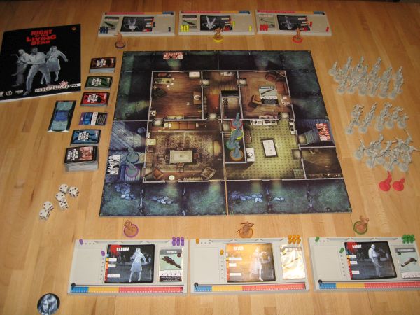 Die Angriffswerte werden dabei durch die getragenen Waffen bestimmt. Mit einer vorgegebenen Anzahl Würfel muss man einen festgelegten Zielwert erreichen; jeder Erfolg ist ein Treffer, der (meist) einen Ghul tötet. Ein netter Gag ist hier, dass man aus zusammengesuchter Ausrüstung „verbesserte Ausrüstung“ bauen kann. So wird aus einem Einmachglas und brennbarer Flüssigkeit ein Molotowcocktail, eine Winchester 94 und ein Zielfernrohr ergeben folgerichtig eine Winchester mit Zielfernrohr. Dennoch: Bei den grundsätzlich schwachen Waffen sollte man tunlichst davon absehen, sich mitten in ein Getümmel zu stürzen. Mehr als andere „Zombicide“-Editionen setzt „Night of the Living Dead“ auf das Vermeiden von Kämpfen. Schnelligkeit und die gute Zusammenarbeit der Figuren sind wichtiger, um gegen die wankenden Ghulhorden zu bestehen.