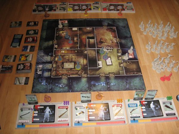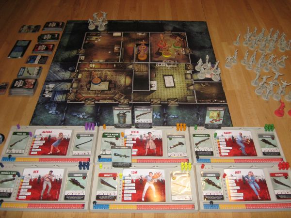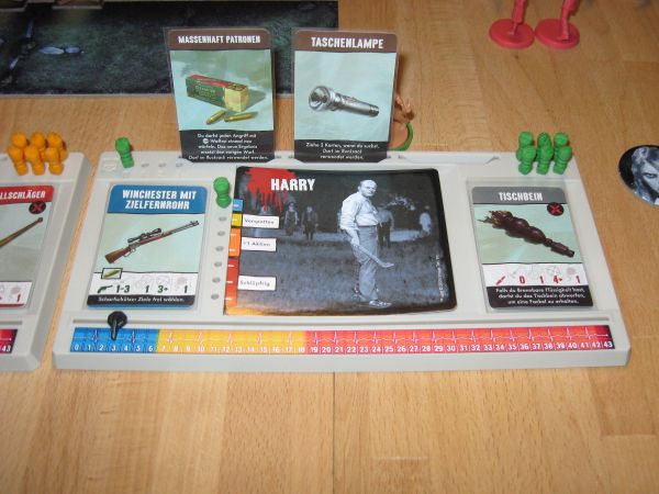 Am Spielkonzept hat sich auch in dieser Inkarnation von „Zombicide“ nichts geändert. Vor dem Spiel wählt man sich eine Szene aus, die den Aufbau des Spielfelds bestimmt und die Siegbedingungen festlegt. Gespielt wird stets mit allen Überlebenden, egal ob 1 Spieler oder 6 am Tisch sitzen. Die Mühe, verschiedene Spielerzahlen auszugleichen, haben sich die Designer nicht gemacht. Die Figuren werden durch farbliche Ringe identifiziert, die zu gleichfarbigen Markierungsstiften auf den Plastiktableaus passen. Anschließend werden noch 6 Waffen – 3 Tischbeine, 1 Hammer, 1 Radschlüssel, 1 Brecheisen und die Winchester 94 – verteilt, dann kann es losgehen.