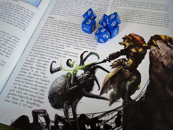 Auch wenn die neu überarbeitete Grundbox den Einstieg für Neulinge wirklich sehr einfach macht, braucht der Spielleiter schon ein bisschen mehr Überblick und Wissen. Deswegen liegt auch ein Spielleiterhandbuch mit den Infos über die Spielwelt bei, aber auch mit Tipps, wie ein Abenteuer gut geleitet werden kann.