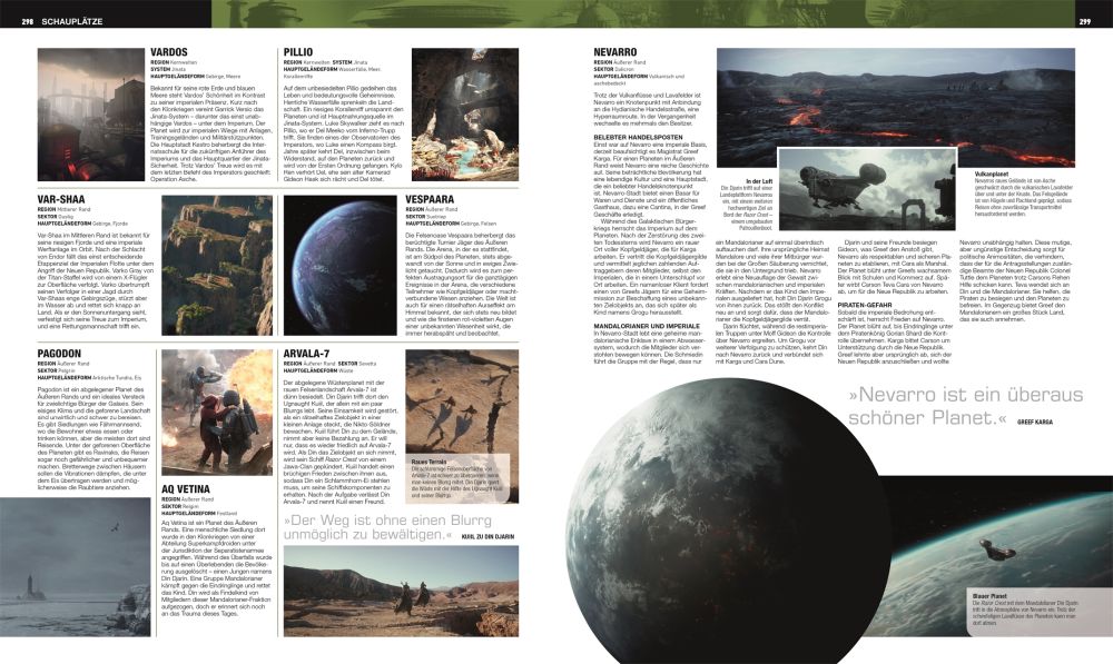 Wie schon sein Vorgänger beginnt das Buch dann mit dem Vorwort von Ryder Windham, das hier um wenige Worte angepasst wurde, um das größere Spektrum des Inhalts abzubilden. Danach meldet sich Ahsoka-Darstellerin Rosario Dawson zu Wort. Anschließend geht es ohne weitere Umschweife direkt los. Das Buch nutzt seinen Platz so gut es geht, um möglichst viele Einträge darin unterzubringen. Man bekommt also ein extrem großes Angebot, gerade bei den Figuren, präsentiert. Das hat zur Folge, dass viele Einträge eher kurz sind und nicht annähernd mit den Informationen in den Online-Lexika mithalten können. Ausnahmen bilden natürlich die Seiten zu den großen Namen. Han Solo wird selbstredend ebenso auf einer ganzen Seite vorgestellt wie Poe Dameron. Planeten haben mitunter sogar zwei und mehr Seiten spendiert bekommen. So oder so haben die Macher ihr Bestes gegeben, um zumindest das Wichtigste zu jedem Eintrag zusammenzufassen.