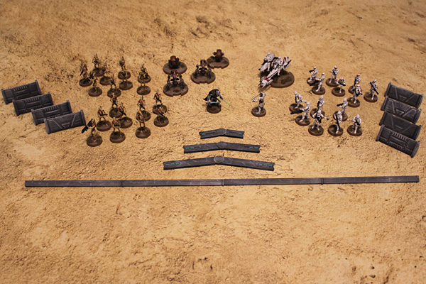 Echte Profis bauen sich dann noch Gelände – also, über die 8 beiliegenden Barrikaden hinaus. Tipps hierzu findet man in Fülle im Internet. Hier bestimmen nur Zeit, Geld und Bastelbegabung die Grenze des Möglichen. Wer einfacher Stimmung erzeugen will, greift zu einer bedruckten Spielmatte aus Neopren oder PVC (wie auf den Fotos als Untergrund verwendet), die man in Hobbyshops erwerben kann. Da sind dann Sand, Gras, eine Eiswüste usw. zu sehen, eine tolle Unterlage für Gefechte auf Planeten wie Tatooine, Naboo oder Hoth. Für eine Standardpartie über 800 Punkte braucht man eine Matte mit den Maßen 90x180 cm, ein schnelleres Gefecht (Skirmish) über 500 Punkte erfordert ein Spielfeld in der Größe 90x90 cm. Mit dem Inhalt dieser Box kann man nur (!) Skirmish-Partien über 500 Punkte spielen, für 800 Punkte sind nicht genug Einheiten enthalten.