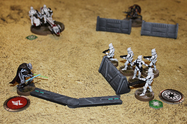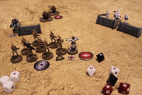 Ist eine Einheit aktiviert worden, kann sie zwei Aktionen sowie gegebenenfalls freie Aktionen durchführen. Aktionen sind Bewegen, Angreifen, Zielen, Ausweichen, Erholung, Bereitschaft oder Kartenaktionen. Es soll hier nicht alles im Detail ausgeführt werden, daher nur ein paar Einblicke. Bewegungen etwa werden sehr elegant mithilfe einer Bewegungshilfe ausgeführt. Je nach Schnelligkeit der Einheit legt man die kurze, mittellange oder lange Bewegungshilfe an den Anführer der Einheit an, zieht diesen dann beliebig weit an der Hilfe entlang und wenn der Anführer steht, werden einfach alle anderen Figuren des Trupps drumherum platziert (sofern vorhanden, Anführer wie Obi-Wan Kenobi handeln natürlich allein). Beim Angriff wählt man eine Zieleinheit aus, prüft die Entfernung, bildet dann aus den Waffen der Angreifer einen Angriffswürfelpool und würfelt den Angriff. Zielmarker und Angriffsenergie können dabei die erwürfelte Treffermenge erhöhen. Deckung, Ausweichmarker und der Verteidigungswurf des Ziel reduzieren diese dann wieder. Treffer, die am Ende übrig bleiben, verursachen Schaden. Alles kein Hexenwerk, wenngleich man die Passage „Deckung“ im Regelwerk genau studieren sollte, denn je nachdem, wie man selbst oder das Ziel in Deckung steht, kann das Ziel nur erschwert oder gar nicht getroffen werden oder man selbst nicht mit allen Figuren angreifen.