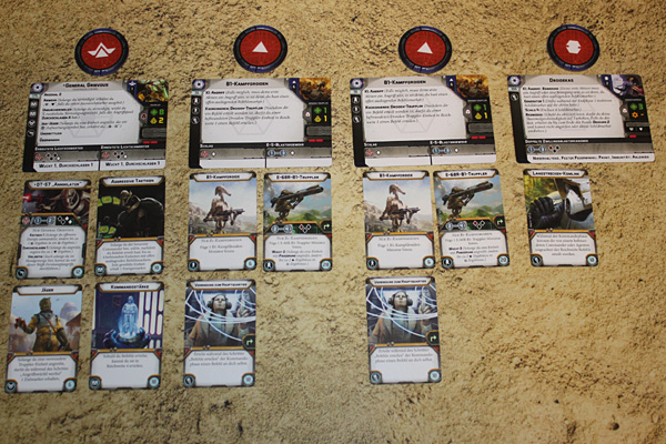 Wie gesagt, gestattet die Grundbox nur die kleineren Gefechte im Skirmish-Format – die Regeln dazu kann man leider nur als PDF von der Asmodee-Website herunterladen, im Grunde ändert sich aber kaum etwas zu den Standardpartien. Man stellt zwei 500-Punkte-Armeen zusammen, spielt auf 90x90 cm Schlachtfeld und die Partie geht über 5 Runden (statt 6 wie im Standardspiel). Da das für einen kurzweiligen Nachmittag völlig reicht, wurde auch nur dieses Format getestet. Etwas ärgerlich dabei: Während sich auf Seiten der Republik 500 Punkte ganz gut erreichen lassen, sind bei den Droiden mit den vorliegenden Einheiten und Aufwertungskarten maximal 467 Punkte drin. Entsprechend startet der Separatisten-Spieler mit einem gewissen Nachteil in die Partie, wenn sich der Republik-Spieler nicht freiwillig beschränkt. Ein Trick, um 100 Punkte mehr zu gewinnen, wäre, den Radmodus der Droideka über einen Marker anzuzeigen, nicht über eine extra Figur. Dann hätte man nämlich vier Droidekas zur Verfügung und könnte zwei Einheiten mit je zwei Figuren aufstellen. Dazu muss man allerdings die Doideka-Einheitenkarte kopieren, da jede Einheit ihre eigene Karte haben sollte. Optimal gelöst ist das jedenfalls nicht von den Machern.