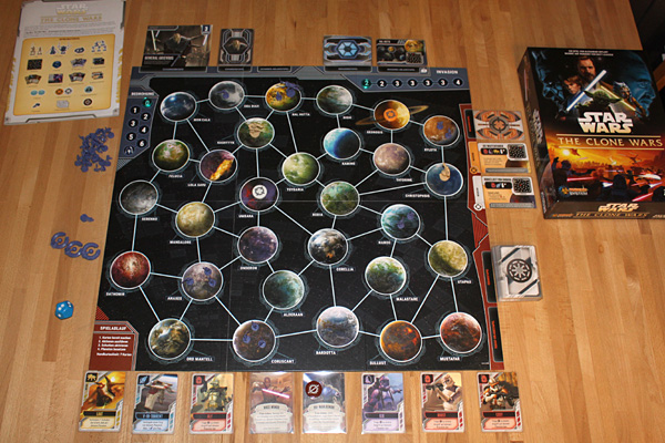 Vor der Partie wählen alle Spieler je einen Jedi aus, den sie übernehmen wollen. Anakin Skywalker, Obi-Wan Kenobi, Mace Windu, Ahsoka, Yoda, Aayla Secura und Luminara Unduli stehen zur Auswahl, die alle jeweils eine eigene Spezialfähigkeit haben. Außerdem entscheidet man sich für einen Gegner: Asajj Ventress wird für den Einstieg empfohlen, schwieriger wird der Kampf gegen Count Dooku, General Grievous und Darth Maul. Je nach gewünschtem Schwierigkeitsgrad wählt man 3 bis 6+ Missionen aus, die bewältigt werden wollen, bevor man sich dem Schurken stellen kann. Diese Skalierung wurde bisweilen kritisiert, denn je schwerer das Spiel sein soll, desto länger dauert es auch. Die angegebenen 60 Minuten Spielzeit stimmen dann nicht mehr. Uns hat das bei den Testspielen nicht gestört, aber wir wollten auch jeweils nur „Star Wars – The Clone Wars“ spielen und haben uns gern auf eine längere Dauer eingelassen. Zu guter Letzt werden noch ein paar Marker platziert, erste Droiden werden mithilfe von Invasionskarten auf dem Spielplan verteilt und zwei erste Missionen werden aufgedeckt.