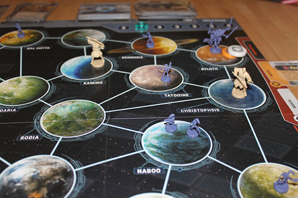 In Schritt drei werden die Schurken aktiviert. Das passiert tatsächlich in jedem Spielerzug. Man zieht eine Schurkenkarte vom individuellen Stapel des Bösewichts und führt sie aus. In der Regel geht es darum, Jedi zu verwunden oder Droiden auf Planeten zu setzen. Letzteres passiert erneut im Schritt „Planeten besetzen“. Hier deckt man zwei bis drei Karten vom Invasionskartenstapel auf und setzt jeweils einen Droiden auf den angezeigten Planeten. Das klingt erstmal wenig, aber dadurch, dass es nach jedem Spielerzug passiert, summieren sich die Klappergestelle. Sind drei auf einem Planeten vorhanden und ein vierter muss gesetzt werden, kommt eine Blockade, außerdem wird der Marker auf der Bedrohungsleiste weitergeschoben. Das passiert auch, wenn einer der Vorräte (Droiden oder Blockade) leer ist oder – eher selten der Fall – wenn der Marker auf der Invasionsleiste das letzte Feld erreicht hat. Sieben Felder hat die Bedrohungsleiste. Hat der Marker das Ende erreicht, gewinnt das Böse (in dem Fall Darth Sidious).