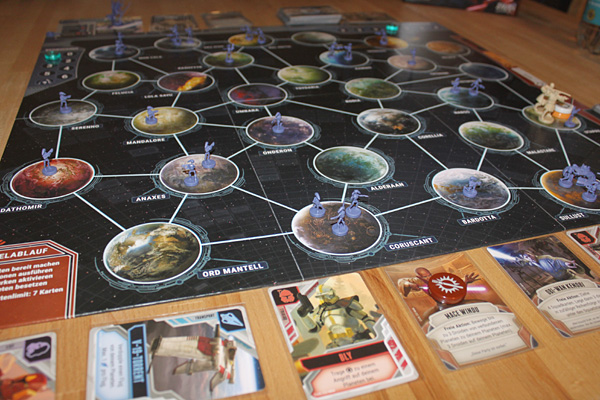 Das Spiel ist wirklich spannend. Eine Partie mag locker anfangen, aber durch die cleveren Mechanismen zieht die Spannungsschraube stetig an. Am Ende muss man genau rechnen, wer jetzt welche Squadkarte wann erschöpft, wie viele Droiden besiegt werden müssen, damit man genug im Vorrat hat für die nächste Invasionsphase und wer sich am besten um was kümmert, um möglichst effektiv zu handeln. Dabei ist die Klonkriegsatmosphäre gut eingefangen, ganz ohne Erzähltexte. Überall marschieren Droiden auf, die Jedi hasten von Krise zu Krise, Klonkrieger fallen, Blockaden werden gebrochen. Das passt alles zur TV-Serie, die den Hintergrund liefert.