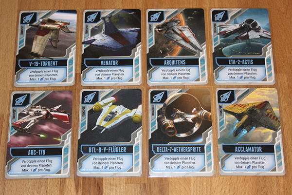 „Verstärkung“ erlaubt das Ziehen eine Squadkarte. Das Kartenlimit liegt bei 7. Die Squadkarten werden offen vor einem ausgelegt. Es gibt vier Arten: Überfall, List, Transport und Rüstung; dazu kommen Verbündete, die individuelle Effekte haben. Überfall und List fügen jeweils einen Erfolg zu einem Angriff oder einem Missionsversuch bei, dürfen aber nur kombiniert werden, wenn es eine Mission ausdrücklich erlaubt. Transport gestattet einmalig pro Zug, die Bewegung von 1 auf 2 zu erhöhen. Rüstung schließlich reduziert Schäden, die man durch Gegenangriffe der Droiden erhält. Unverhinderter Schaden reduziert übrigens die eigenen Karten jeweils um eins. Es gehen also Truppen, Fahrzeuge und Schiffe verloren. Dadurch wird man ineffektiver und ist zur Aktion „Verstärkung“ gezwungen, sterben können die Jedi aber nicht. Sehr schön: Solange ein anderer Jedi auf deinem Planeten agiert, kannst du eigene Squadkarten erschöpfen, um ihm bei seinen Aktionen zu helfen, auch wenn du nicht am Zug bist.