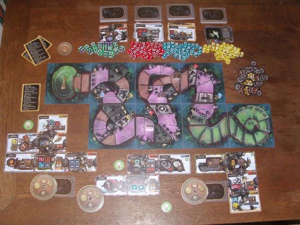 Das Design und die Spielbestandteile sind alle super (die Würfel sind herrlich). Die Rennmaschinen, die man sich im Laufe eines Rennens zusammenbaut, sind ebenfalls aberwitzig. Wenn man ein paar Runden gespielt hat und sich im Spiel zurecht findet, spielt sich ein Rennen auch recht flott, sodass man auch zwei Rennen an einem Abend starten kann. Natürlich abhängig von der Streckengröße, über die man selber entscheiden kann.