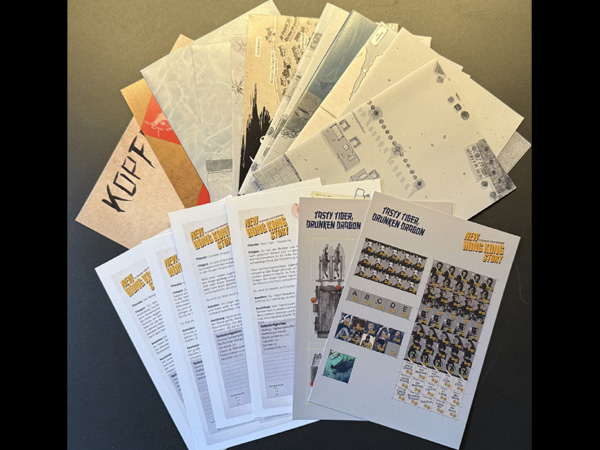 Doch wie bei „New Hong Kong Story“ üblich, ist das Abenteuerbüchlein (80 Seiten A5 mit praktischer Spiralbindung) nur ein Teil des Abenteuerpakets. Eine dicke Mappe mit Gummiverschluss ist prall gefüllt mit Karten, NSC-Bildern, Tokens, Handouts und einem schicken Lesezeichen. Das Material ist wieder hervorragend, gut produziert und auch noch hübsch. Die Fotos sagen mehr, als ich dazu erklären könnte.