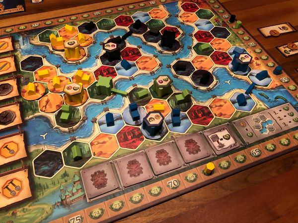 Wie bereits erwähnt, bleibt das Spielsystem von „Terra Mystica“ bei „Terra Nova“ an sich erhalten. Wir wählen ein Volk und versuchen über 5 Runden Landschaften zu erkunden und zu bebauen. Dabei müssen wir, wie gehabt, die Landschaften mit Hilfe der „Spaten“-Aktion zuerst in die Farbe unseres Volkes umwandeln. Das Bauen von Häusern, Kontoren, Palästen und Brücken gibt uns zu Beginn jeder Runde Einkommen, Vorteile und/oder generiert Siegpunkte während und am Ende des Spiels. Neben Geld als Währung gibt es auch den von „Terra Mystica“ bekannten Mechanismus der Machtschalen. Erhält man Macht, muss man zuerst die erste Schale leeren und danach die zweite. Bezahlt werden kann nur aus der dritten Schale. Wer Macht für Aktionen verwendet oder diese in Geld umwandelt, schiebt diese zurück in die erste Schale und der Kreislauf beginnt von vorn.