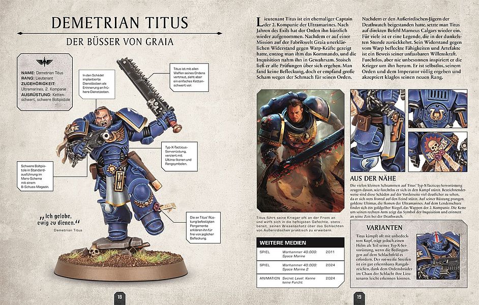 Die 120 Einträge, das Herz des Bandes, sind alle in gleicher Weise aufgebaut. Der Umfang liegt bei einer Seite für Nebenfiguren, zwei Seiten für wichtigere Gestalten und vier Seiten für die größten Berühmtheiten des Universums, etwa den Ultramarine-Primarchen Roboute Guilliman oder den Kriegsherr des Chaos Abaddon der Vernichter. Jeder Eintrag bietet einen kleinen Datenbank-Kasten, der Name, Rang, Zugehörigkeit und Ausrüstung auflistet. Ein kleiner Fließtext bringt uns die Figur näher, dazu gesellen sich die berühmten DK-Infoschnipsel, die rings um die Bebilderung angeordnet sind. Längere Einträge weisen auch gern mal eine kurze Zeitleiste mit den größten Taten der Figur auf oder aber eine kleine Tabelle, die auflistet, in welchen Büchern, Filmen oder Videospielen man diese besonders prominent präsentiert bekommt. Bei unserem guten Titus sind das beispielsweise die zwei „Space Marine“-Videospiele und der Animationsfilm „Secret Level: Kenne keine Furcht“.