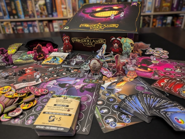 Das Brettspiel hingegen kommt zwar wesentlich bunter daher, ist aber ebenfalls leicht morbide angehaucht, da man die Führung einer kleinen Armee übernimmt, um Gebiete des Wunderlands zu erobern. Für 2 bis 5 Spielende ab 14 Jahren soll es in dreißig Minuten pro Fraktion spielbar sein. Die Zeitangabe ist schon realistischer, als man es von so manch anderem Spiel gewohnt ist, aber selbst zu viert muss man schon mit drei statt zwei Stunden rechnen. Außerdem ist es mit zwei Personen zwar spielbar, aber längst nicht so spaßig wie zu viert. Zu dritt ist es immerhin schon ganz gut. 14 Jahre halte ich für ein wenig zu hoch gegriffen, wenn es um die Spielmechaniken geht, aber auf Grund des wirren Themas kann man das schon so vertreten.