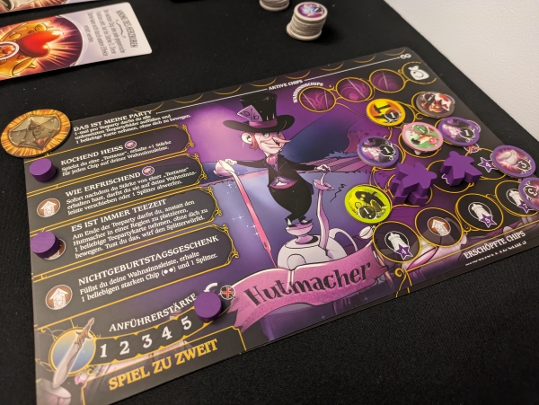 Doch zunächst muss man sich für einen der fünf Hauptcharaktere entscheiden. Alle haben individuelle Fähigkeiten, die man ausbauen und entwickeln kann, und alle haben Entwicklungsleisten, die mit der Zeit freigeschaltet werden können. Sei es nun Alice, die Grinsekatze, der Hutmacher, die Herzkönigin oder der Jabberwocky, sie sind alle besonders und spielen sich sehr unterschiedlich. Sind die Charaktere und das Spielmaterial verteilt, geht es in der ersten Phase der ersten Runde darum, sich aufzurüsten. Man versucht die genannten Einheiten in die umkämpften Gebiete zu schicken, möchte starke Chips für den eigenen Beutel gewinnen, Aufträge ergattern, Aufträge erfüllen, Fähigkeiten ausbauen, Chips schmieden, Wahnsinn abwerfen und manchmal auch wahnsinnig werden. Und natürlich kann man nicht alles gleichzeitig tun, und die Konkurrenz schläft ganz und gar nicht.