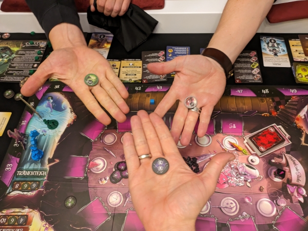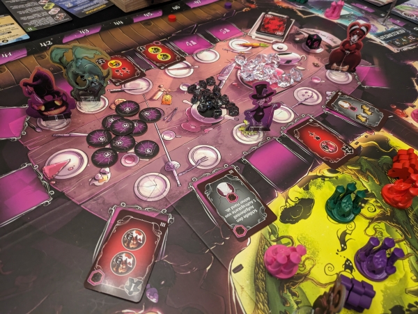 Aber wo wir gerade von den Draftrunden sprachen: Auch die haben ihren Reiz, selbst wenn der wesentliche Kern des Spiels natürlich im Kampf liegt. Die heißbegehrten Karten werden um die Teetafel in der Mitte des Spielbretts herum ausgelegt und reihum bewegen wir unsere Figuren um den Tisch. Dort, wo wir enden, dürfen wir uns die Karte nehmen. Dabei dürfen wir auch so weit laufen wie wir wollen, was toll ist, weil wir jede beliebige Karte nehmen können. Allerdings werden die Karten jedes Mal aufgefüllt, wenn wir den Tisch umrundet haben, was so mitteltoll ist, weil man den anderen eine größere Auswahl an Karten liefert. Außerdem tankt man in diesem Moment ein wenig Wahnsinn, was wiederum gar nicht toll ist, weil man als Wahnsinniger auch Wahnsinnschips in den eigenen Beutel bekommt, die ihrerseits die Chancen im Kampf verschlechtern. Mit diesen Überlegungen und dem Zwang, die Karten ausgewogen zu wählen, befindet man sich in herrlichen Mehrfachzwiespalten (ja, das Wort gibt es nicht – geschenkt – wir sind schließlich im Wunderland).