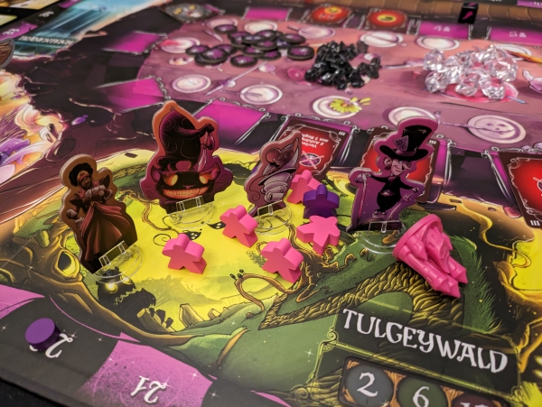 Es gibt eine Deluxe Edition, aber selbst in der Standardversion macht das Spiel eine Menge her. Der Spielplan ist groß und stimmungsvoll gestaltet, die Figuren sind große Standees, die Beutel sind robust und von guter Größe und auch an den Pappchips, die man im Laufe des Spiels aus den Beuteln ziehen muss, ist nichts auszusetzen. Insgesamt sind es vor allem die modernen Illustrationen im Comic-Stil, die eine Menge Stimmung auf den Tisch bringen. Oder um es zusammenzufassen: Wem das Cover der Spielbox schon gefällt, wird den Rest lieben.