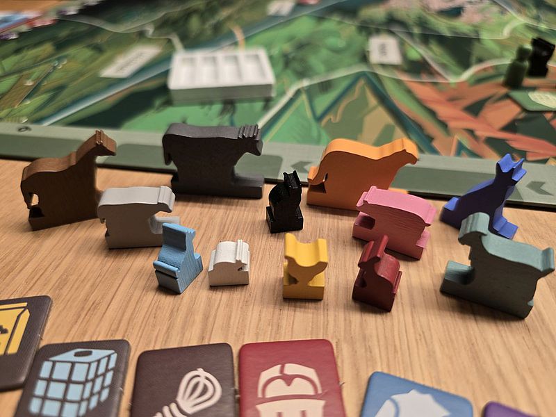 Alle Token und Karten haben vernünftige Qualität und sind vor allen Dingen konzeptionell sehr gut gestaltet. Mittels der klaren Ikonografie können alle Spieler jederzeit die Übersicht behalten. Der Spielplan ist ansprechend gestaltet und groß. Das muss er sein, damit alle Fahrzeuge und Tiere dort Platz finden. Die sich in die Landschaft einfügenden Gewässer und Brücken haben eine spielmechanische Funktion. Hier übersieht man vielleicht am ehesten mal was. Einzig die „shelters“ wirken als Obdach / Unterkunft für die Tiere form-follows-function-esque sehr uninspiriert. Ach ja, das Pappinlay der Spieleschachtel ist durchaus hilfreich und darf bleiben.