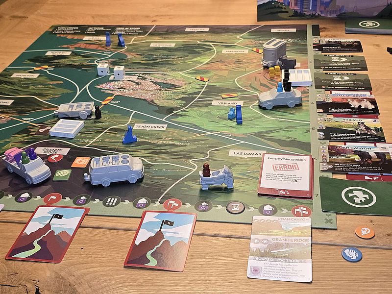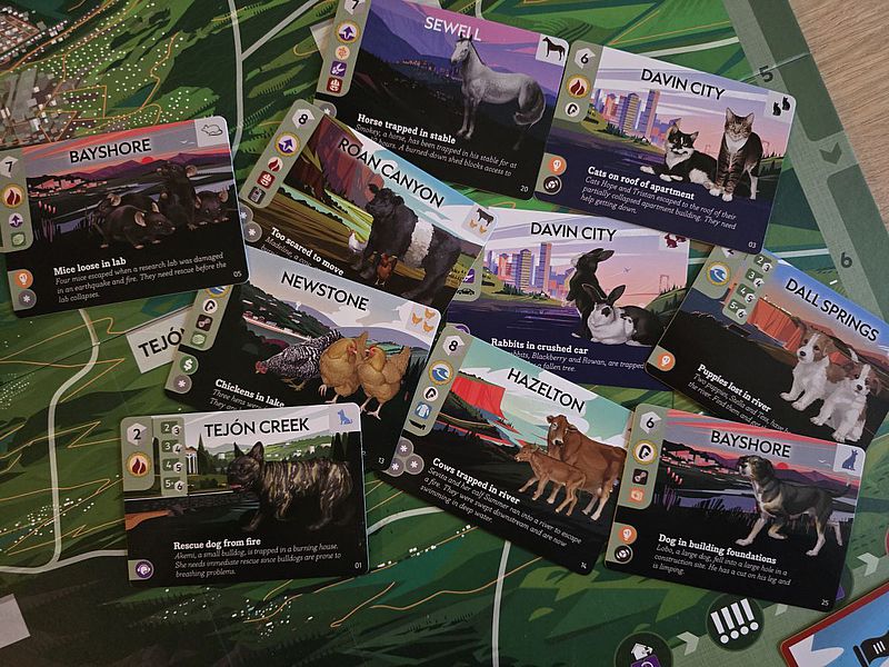 Gemeinsam sind wir als Team auf dem Spielplan unterwegs, um die Kartenauslage auf der rechten Seite des Plans im Griff zu behalten: die Tiernotfälle in der Region rund um Davin City. Nach jedem Spielerzug wird hier eine neue Notfallkarte aufgedeckt. Bereits vorhandene Karten werden nach unten durchgeschoben. Verlässt eine dieser Karten unerledigt, das heißt nicht umgedreht, den Spielplan, endet das Spiel mit einer Niederlage. Eine zweite Uhr tickt an der unteren Kante des Spielplans gegen uns. Die Sanduhr auf dem „Time Track” rückt potenziell durch Rettungsaktionen weiter voran. Das entscheiden die Würfel. Ein gewürfeltes Sanduhr-Symbol auf einem der beiden Würfel lässt den Marker vorrücken. Wenn wir am „Time Track“ ausliegende Missionen nicht rechtzeitig erledigt haben, ist das Spiel ebenso zu Ende. Niederlage. Tränchen.