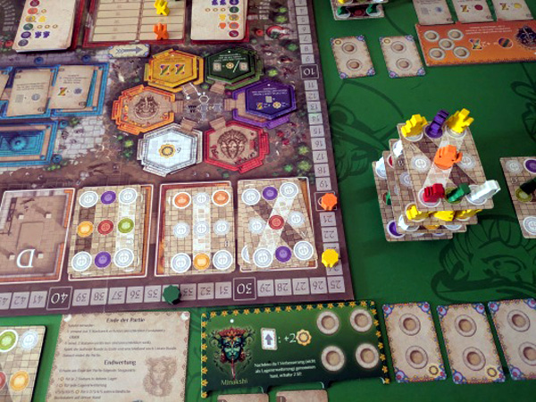Der Minakshi-Tempel in Madurai am südlichen Zipfel von Indien ist eine große Anlage mit zwölf Gopurams. Ein Gopuram ist ein hohes Gebäude, dessen äußere Verzierungen hauptsächlich Figuren beziehungsweise Menschen darstellen, sodass es so aussieht, als würden diese die einzelnen Stockwerke tragen. Diesem interessanten Bild folgend, sammeln wir farbenfrohe Säulenfiguren, um diese auf Karten zu platzieren. Im Laufe des Spiels werden Stockwerkkarten auf die Säulen gelegt und darauf weitere Säulen gestellt, um Siegpunkte zu ergattern. Was von außen wie ein Geschicklichkeitsspiel aussieht, ist gar nicht so kippelig, wie man vielleicht erwarten möchte und entpuppt sich als fluffiges Workerplacement-Spiel. Die Aktionen sind einfach gehalten und sind schnell ausgeführt. Zudem bestimmt die Aktionswahl auch die Spieler:innenreihenfolge der nächsten Runde. Der Ersteindruck war auf jeden Fall gut, der Preis ist allerdings nicht gerade gering. Wer richtig tief in die Tasche greift, kann auch eine Deluxe-Variante bekommen, deren Säulenfiguren noch opulenter daherkommen.