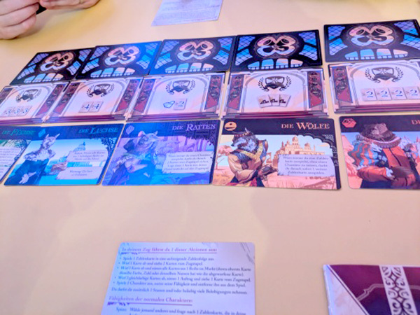 In fünf Reichen werden wir durch unsere Kartenauslage am Ende des Spiels Punkte bekommen. Dafür müssen wir für jede Farbe einen Stapel bilden und uns von eins bis sechs nach oben arbeiten. Jede Runde legen wir Karten aus oder bedienen uns an der Marktauslage. Dabei sollte man immer im Blick behalten, was man den anderen anbietet, um ihnen keinen Vorsprung zu verschaffen. Einmal pro Spiel kann man auch eines der fünf Reiche als Verbündeten gewinnen und sich damit Sonderfertigkeiten verschaffen sowie den anderen geheime Sonderaufträge wegschnappen. Sonderkarten mit Sondereffekten sind vorhanden, bestimmen aber keineswegs die Kartenhand. Ein schnelles, taktisches Spiel mit einigen Kniffen und Varianz. Auch dieser Ersteindruck war gut, eine ausführliche Rezension folgt.