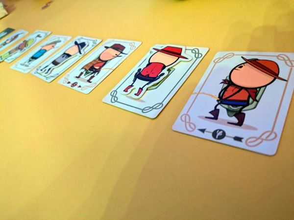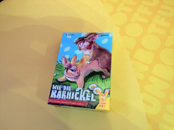 Ein Geschicklichkeitsspiel, in dem man Karten aus einem Meter Entfernung auf den Tisch an bestimmte Orte werfen muss, um als Pärchen kleine Karnickel zu zeugen und unsere Konkurrenz daran zu hindern. Wir waren alle sehr schlecht in dem Spiel und nach der dritten Runde auch ziemlich sprachlos. Um es nett zu formulieren: Es zündete nicht wirklich.