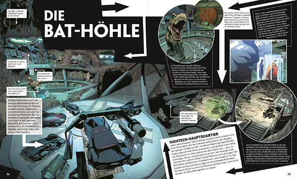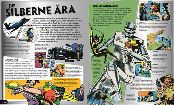 In dieser Hinsicht aber ist das Buch ein Werk von unglaublicher Detailfreude und Sachverstand. Nach einem Vorwort, einer Einleitung und einem kurzen realhistorischen Blick auf Batmans „Geburt“ folgen zunächst mehrere „Kapitel“ zu Batmans Anzug, seinen Waffen, seiner Höhle, seinen Fahrzeugen und mehr. Diese werden – wie auch sonst die meisten Kapitel im Buch – jeweils auf einer Doppelseite präsentiert, die reich mit Comic-Illustrationen bebildert ist und in bekannter DK-Manier Informationen in Form zahlreicher kleiner Textblöcke darbietet. Das mag an der jeweiligen Stelle nicht besonders in die Tiefe gehen, bietet aber einen guten ersten Eindruck und hat insgesamt über das Buch verteilt den Effekt von tausend Mosaiksteinen, aus denen sich im Laufe der Lektüre ein umfassendes Bild von Batman und seiner Welt zusammensetzt.