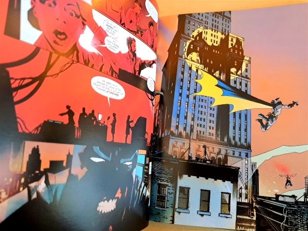 Bereits nach diesen wenigen Seiten ist man mittendrin in der Geschichte und wird von den ersten Zeichnungen beeindruckt sein. Denn diese füllen die großformatigen Seiten (25 x 32 cm) kunstvoll und prächtig aus. Mal sieht man Batman über eine ganze Seite und ein anderes Mal strecken sich die Geschehnisse großflächig über zwei Seiten. Zudem entsteht das Gefühl, man befände sich „live“ vor Ort in Gotham City – so eindrucksvoll gelingen Jock die Bilder. Vertieft wird dies durch die Farbgebung. Es wechseln sich die Farben der Dunkelheit (Blau, Schwarz und Grün) mit den Farben der Explosionen und Mündungsfeuer (Rot, Orange und Gelb) ab.