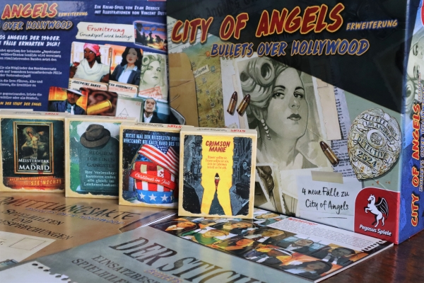 Wer „City of Angels“ mit seinen neun unterschiedlich gelagerten Fällen komplett durchgespielt hat und mehr von diesem Spielerlebnis haben möchte, der findet mit „City of Angels – Erweiterung 1: Bullets over Hollywood“ eine Erweiterung, die das Spielkonzept beibehält und Schlaglichter auf neue Verbrechen und Skandale in L.A. der 1940er Jahre wirft. Einzig beim Fall „Requiem für einen Gangster“ ist zu beachten, dass es ein Errata von Pegasus Spiele gibt (https://pegasusshop.de/media/pdf/e1/40/ca/Errata_CoA_BoH.pdf) und dass man beim Abspielen des Epilogs auf der Homepage auf die „alternative Wiedergabe & Download“ klicken muss, da der Webplayer fehlerhaft „0 Minuten“ anzeigt. Wer übrigens das Spiel ohne Internet spielen möchte, der lädt sich am besten vorab die Audiodateien herunter, um sie so problemlos abspielen zu können.