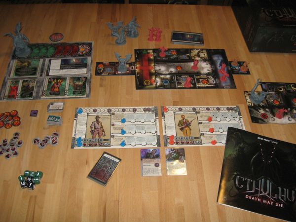 Fazit: „Cthulhu: Death May Die“ ist ein kooperatives Pulp-Cthulhu-Spiel, das viele bekannte Mechanismen anderer cthuloider Brettspiele aufgreift und mit großartigen Miniaturen sowie einem außergewöhnlich individuellen Missionsaufbau kombiniert. Ein eher geringer Erzählanteil, ein fehlender Kampagnenmodus sowie der (angesichts der Spielkomponenten) angemessene, aber doch recht hohe Preis mögen manchem Spieler sauer aufstoßen. Trotzdem kann ich das Spiel jedem Freund cthuloider Unterhaltung nur empfehlen. Das Balancing ist super, die Spannung am Spieltisch hoch, ohne zu frustrieren, und obendrein habe ich selten erlebt, dass wirklich jeder Ermittler irgendwie zum Ausprobieren einlädt, weil seine Fertigkeitskombination einfach gut ist. Von allen Brettspielen mit Mythos-Thematik, die ich besitze, ist dieses – neben „Arkham Horror: Das Kartenspiel“ – aktuell mein Favorit. (Und jetzt hoffe ich, dass mein Kickstarter-Material bald kommt. Ich will mehr Großen Alten den ledrigen Hintern versohlen!)