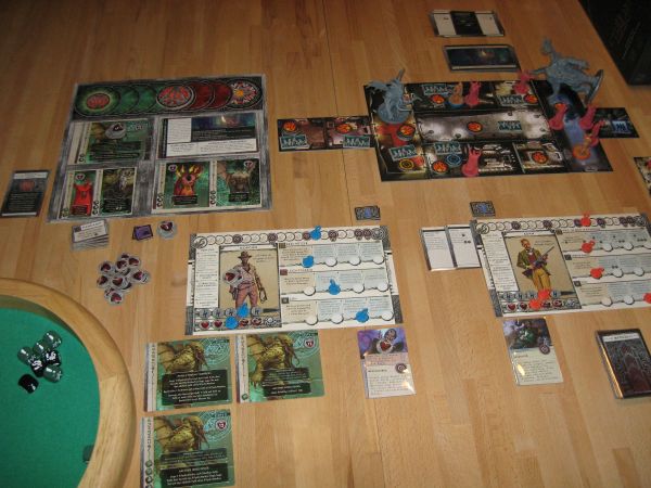 Auch im Spielgefühl unterscheidet sich „C:DMD“ von verwandten Produkten, denn es hat einen offensiveren Ansatz. Hier versuchen die Ermittler nicht bloß irgendwie durchzukommen, während sie ihren Job machen, sondern teilen auch ordentlich aus. Eine gut ausgerüstete Magierin beispielsweise kann gegen Ende der Partie schon mal 6-8 Schadenspunkte pro Aktion raushauen. Kultisten haben 2 Lebenspunkte, ein Feuervampir 4 und Hastur 36 (verteilt über drei Stufenkarten, die nach und nach enthüllt werden). Aufpassen muss man trotzdem, denn es gilt nicht nur, Wunden zu vermeiden und den Stress klein zu halten, man muss auch auf seine geistige Gesundheit achten. Die „Leiste für Geistige Gesundheit“ ist ein wichtiges Spielelement. Dass man wahnsinnig wird, ist hier nicht bloß bedauerlicher Nebeneffekt, sondern zugleich wünschenswerter Zustand, denn je irrer man wird, desto mehr Bonuswürfel und Level in den individuellen drei Charakterfertigkeiten erhält man. „Der Wahnsinn treibt uns an“, heißt es im Introtext vielsagend. Das passt in „C:DMD“ wirklich! (Doch wenn man zu viel davon ansammelt, kann die Partie auch urplötzlich vorbei sein, denn es gibt keinerlei Möglichkeit, geistige Gesundheit zu regenerieren.)