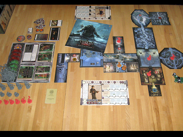 Am Spielprinzip hat sich, wie gesagt, nichts geändert. Nach wie vor übernehmen 1 bis 5 Spieler ab 12 Jahren die Rolle von Ermittlern, die in verschiedenen „Episoden“ Aufgaben erfüllen müssen, um am Ende die Gelegenheit zu bekommen, gegen einen der Großen Alten anzutreten. Besiegen sie diesen, haben sie das Spiel gewonnen. Werden sie vorher wahnsinnig, sterben oder gelingt dem Großen Alten der vollständige Wechsel in die Wirklichkeit, ist das Spiel verloren. Vor Spielbeginn wählen wir unseren Ermittler, der je drei individuelle Fähigkeiten hat, und bekommen zusätzlich eine zufällige Psychose, die uns das Leben schwerer macht. Dann wird eine Kombination aus einem Großen Alten und einer Episode gewählt, deren spezielles Spielmaterial – Monster, missionsspezifische Entdeckerkarten, Mythoskarten etc. – aus separaten kleinen Pappboxen genommen und gemischt wird und dann gemeinsam mit dem allgemeinen Material (Spielplanteile, Marker, Miniaturen) eine Partie ergeben. Diesen modularen Ansatz fand ich schon immer genial, und er funktioniert auch immer noch sehr gut.
