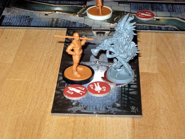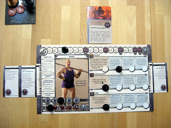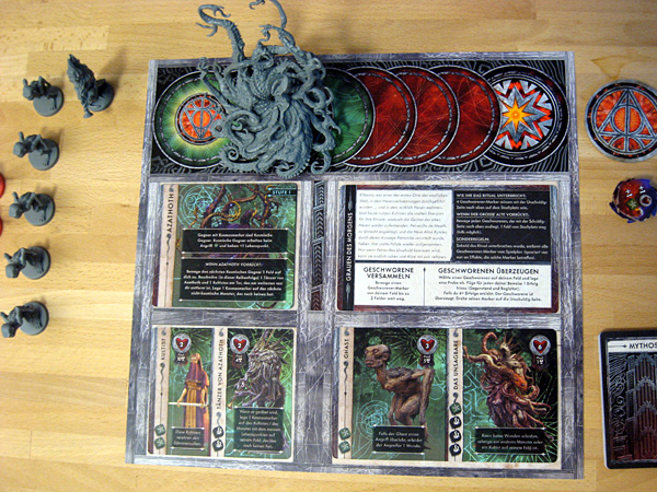 Anschließend wird eine Mythoskarte gezogen, die negative Effekte mit sich bringt. Dadurch bewegen sich Gegner, es tauchen neue auf, man wird zu Proben gezwungen und erhält Stress. Außerdem sammelt man über die Zeit Symbole, die den großen Alten auf einer Beschwörungsleiste vorrückten lassen. Diese Leiste dient als Timer, der einerseits die Zeit bis zum Erscheinen des Oberbosses als auch bis zum Ende des Spiels misst. Steht man in Phase 3 ohne Gegner auf seinem Feld, kann man „ermittlen“. Hierzu zieht man eine episodenspezifische Entdeckungskarte, die ein klein wenig Story preisgibt und dann eine Probe oder Stress abverlangt, um einen Begleiter oder Gegenstand zu erhalten. Versagt man hier, fängt man sich meist einen negativen Zustand ein. Zu guter Letzt werden ein paar Effekte zum Zugende abgehandelt, dann ist die nächste Person an der Reihe.