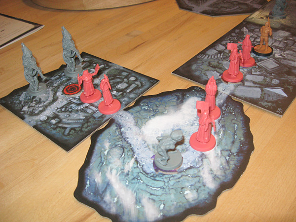 Gespielt wird im Uhrzeigersinn, wobei jeder Spieler in seinem Zug alle 4 Phasen (Aktionen ausführen, Mythoskarte ziehen, Ermitteln oder Kämpfen, Ende des Zuges) durchlaufen muss. Insofern bleibt das Spiel vom Balancing her immer ähnlich schwer, egal ob man allein spielt oder mit vier Freunden. Bei den allgemeinen Mechanismen erfindet CMON das Fass unverändert nicht neu. Ist man an der Reihe, kann man 3 der folgenden Aktionen (auch mehrfach) durchführen: laufen, angreifen, sich ausruhen oder Gegenstände tauschen. Dazu kommen episodenspezifische Aktionen. Dabei will das Spiel eigentlich immer, dass man über den Spielplan jagt, um gewisse Aufgaben zu erfüllen: Beispielsweise muss man Dörfler von der Unschuld einer Frau überzeugen oder Kultisten Schlüssel abjagen, um damit die vier verschlossenen Portale zu einem Turm zu öffnen.